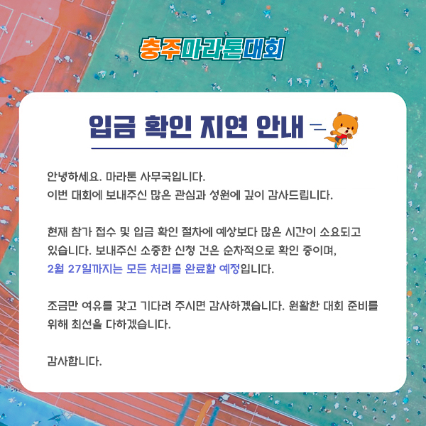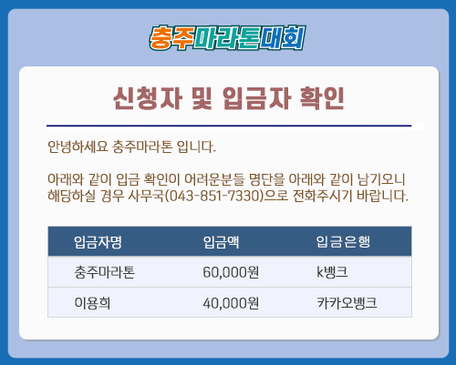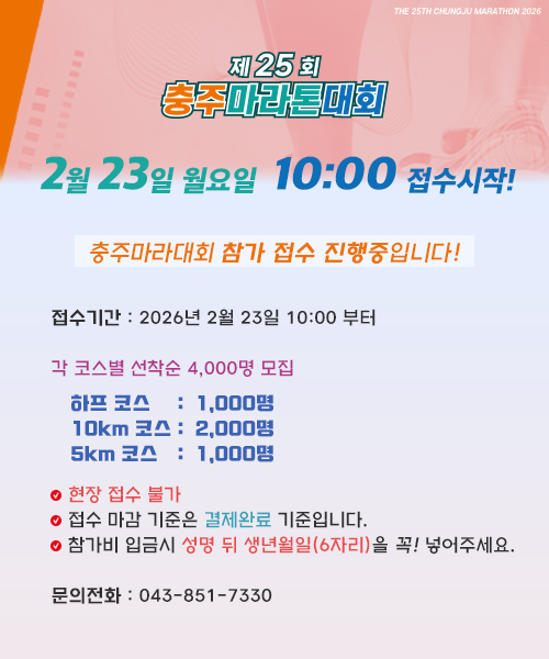 충주마라톤대회 자유게시판 또는 사무국 전화번호 043-850-7331번으로 연락 주시면 됩니다.